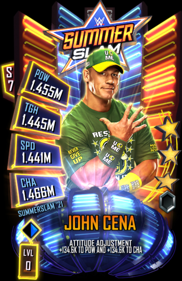 Um den diesjährigen SummerSlam von WWE® SuperCard’ zu feiern, können die Spieler sich zudem auf die Rückkehr von John Cena und sein für begrenzte Zeit einlösbares "Summer of Cena"-Geschenk** freuen, das aus vier Karten von John Cena, 500 SuperCoins und einer "SummerSlam ’21"-Kartenrückseite besteht.