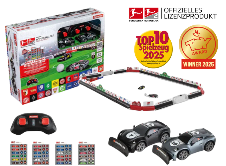 Zu Hause auf dem Tisch oder auf dem Boden startet das rasante Duell mit dem neuen Carrera RC Fußball Set Modell Bundesliga. Bereits prämiert mit dem ToyAward 2025 in der Kategorie SchoolKids, überzeugt das Set durch seine innovative Kombination aus Racing- und Fußball-Action sowie langanhaltendem Spielvergnügen. Jede Menge Zubehör sorgt für authentisches Fußballfeeling wobei der Rennspaß ebenfalls nicht zu kurz kommt. Aus 22 Bandenstücken mit reichlich Deko-Elementen im Fußball-Look entsteht im Handumdrehen das eigene heimische Stadion. Darüber hinaus enthält das Set auch einen Ball, zwei Tore und natürlich zwei Mini RC - Bundesliga-Autos in Schwarz und Grau samt Controller. Die beiden Fahrzeuge können dank Original-Bundesliga-Lizenz mit Stickern von 24 Clubs gestaltet werden – darunter alle Bundesligisten sowie beliebte Clubs aus der 2. Bundesliga. So wird direkt klar, für welchen Club das Herz der Fans schlägt. Link: 2,4GHz RC Soccer Set Modell Bundesliga