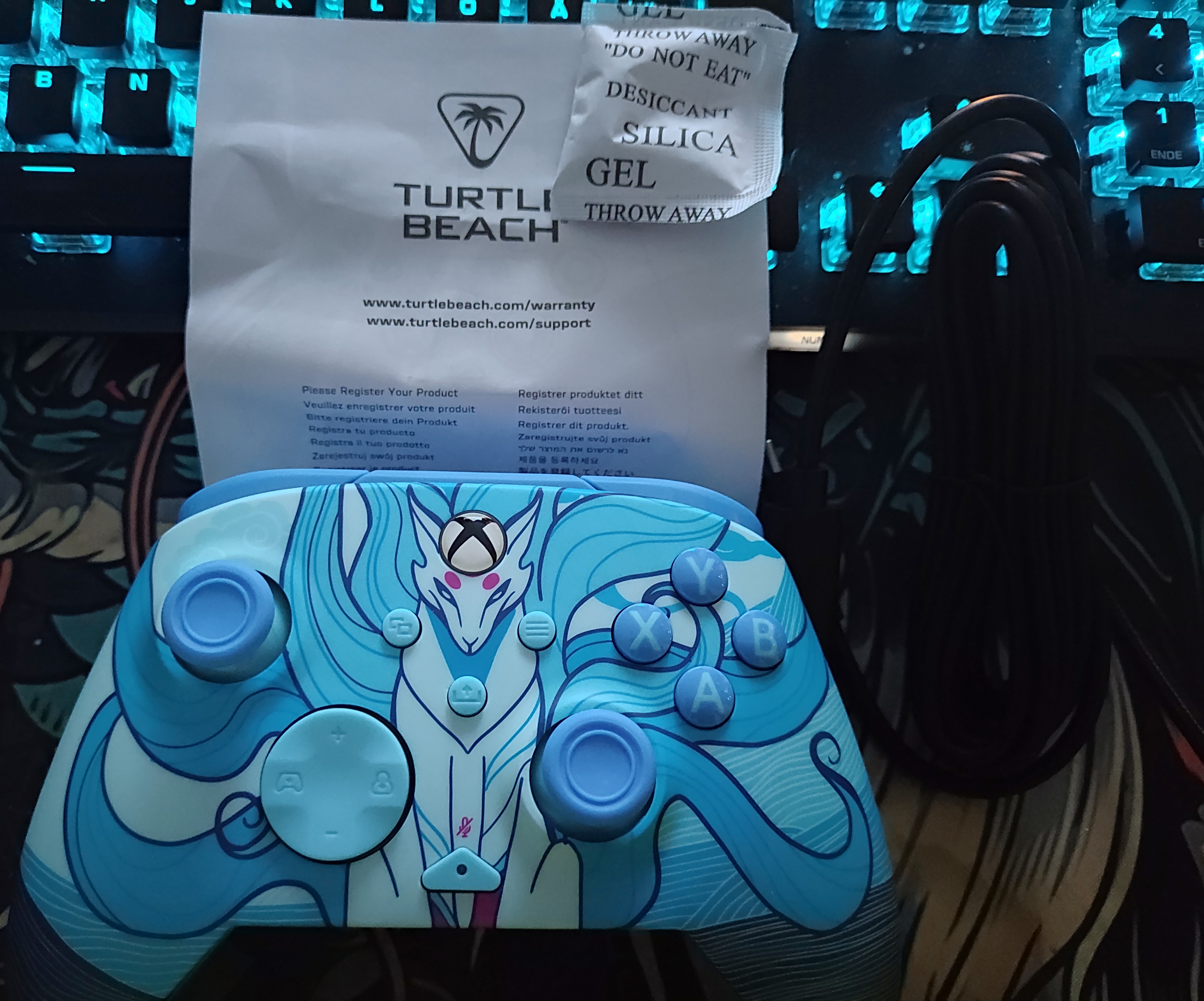 Der Inhalt der Verpackung ist minimalistisch und beschränkt sich auf das Nötigste, um den Controller anzuschließen und zu spielen. Dazu gehören der Rematch™ Advanced, den ich gleich näher beschreiben werde, ein 2,5 Meter langes USB-C-Kabel zum Anschließen und Trennen vom Controller sowie eine Anleitung zum Einschalten des Geräts mit einem QR-Code, der zu einer detaillierteren Anleitung führt. Leider fehlen nützliche Extras wie zusätzliche Polster für die Analogsticks, aber wenn man bedenkt, dass das Ganze auf der offiziellen Turtle Beach Website für nur 39,99 € verkauft wird, war es schwierig, eine große Auswahl an zusätzlichem Zubehör in der Verpackung zu erwarten. Der Controller selbst ist in vier verschiedenen Farben erhältlich (Cotton Candy, Blue Kitsune, Kyoto Bloom und Dark Cosmos), die alle ihre eigenen einzigartigen optischen Merkmale aufweisen. Ich hatte die Gelegenheit, das Modell Blue Kitsune zu testen, das sich durch eine wunderschöne blaue Farbgebung mit einem stilisierten Fuchs auszeichnet, der aufleuchtet, sobald der Controller angeschlossen wird. Der Controller ist ziemlich ähnlich wie der klassische Xbox-Controller, also sehr solide, ausgewogen und bequem zu halten. Allerdings ist die Oberfläche ziemlich glatt und hat nicht die leicht raue Beschaffenheit, die man von den offiziellen Microsoft-Controllern kennt, was man bei längeren Spielsitzungen ein bisschen spürt. Darüber hinaus verfügt der Controller über zwei Trigger mit variabler Empfindlichkeit, dank der Schieberegler auf der Rückseite, mit denen man bequem zwischen den beiden Druckmodi wechseln kann, zwei schnell reagierende Schultertasten, die nach Belieben zugewiesen werden können, einen doppelten Motor für die Vibrationen des Controllers und der Trigger, Regler zur Einstellung der Spiellautstärke und zur Deaktivierung des Mikrofons, die für eine schnelle Audio-Steuerung im Multiplayer-Modus nützlich sind, sowie die offizielle Xbox-Lizenz mit Kompatibilität mit Xbox Series X|S, Xbox One und Windows 10/11-PCs.