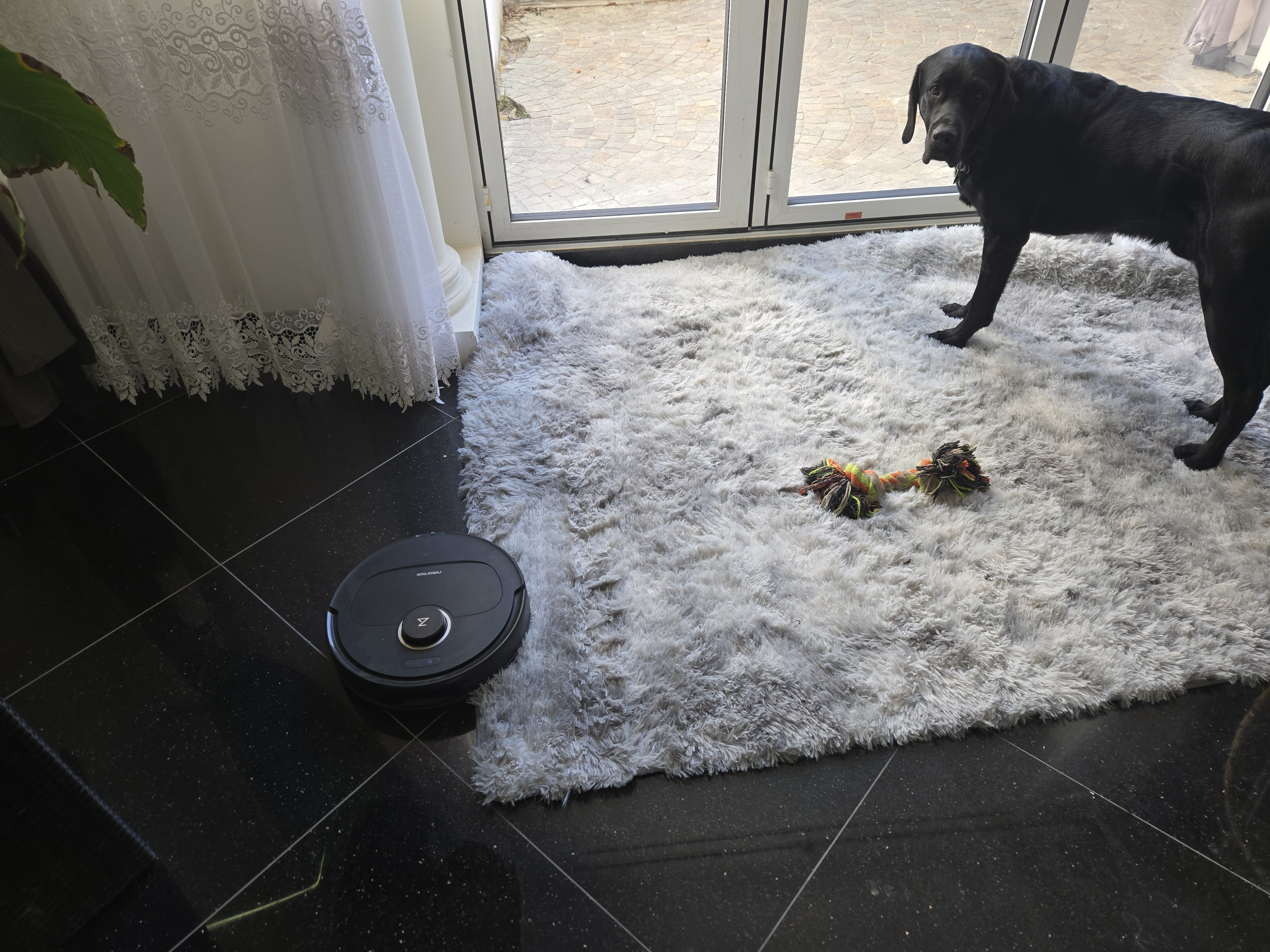 I would also like to note here: The test conditions for the Qrevo Pro were incredibly tough! Over 200m² to clean daily. Dog hair, long-haired carpets, granite floors, obstacles like bar stools, moving objects, dogs running around leaving dirty footprints everywhere, flower pots, and much more.