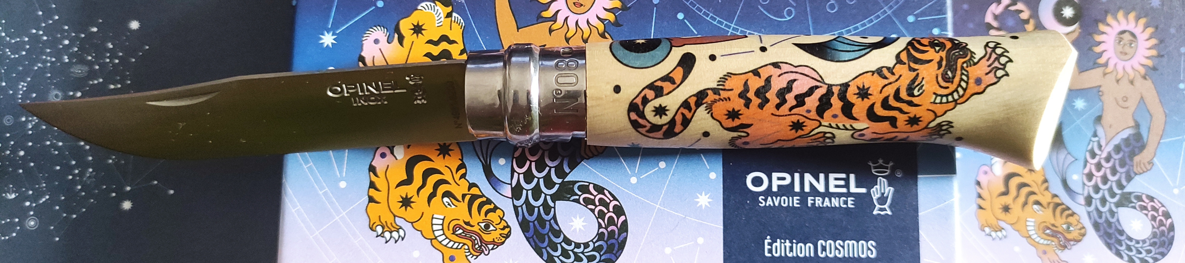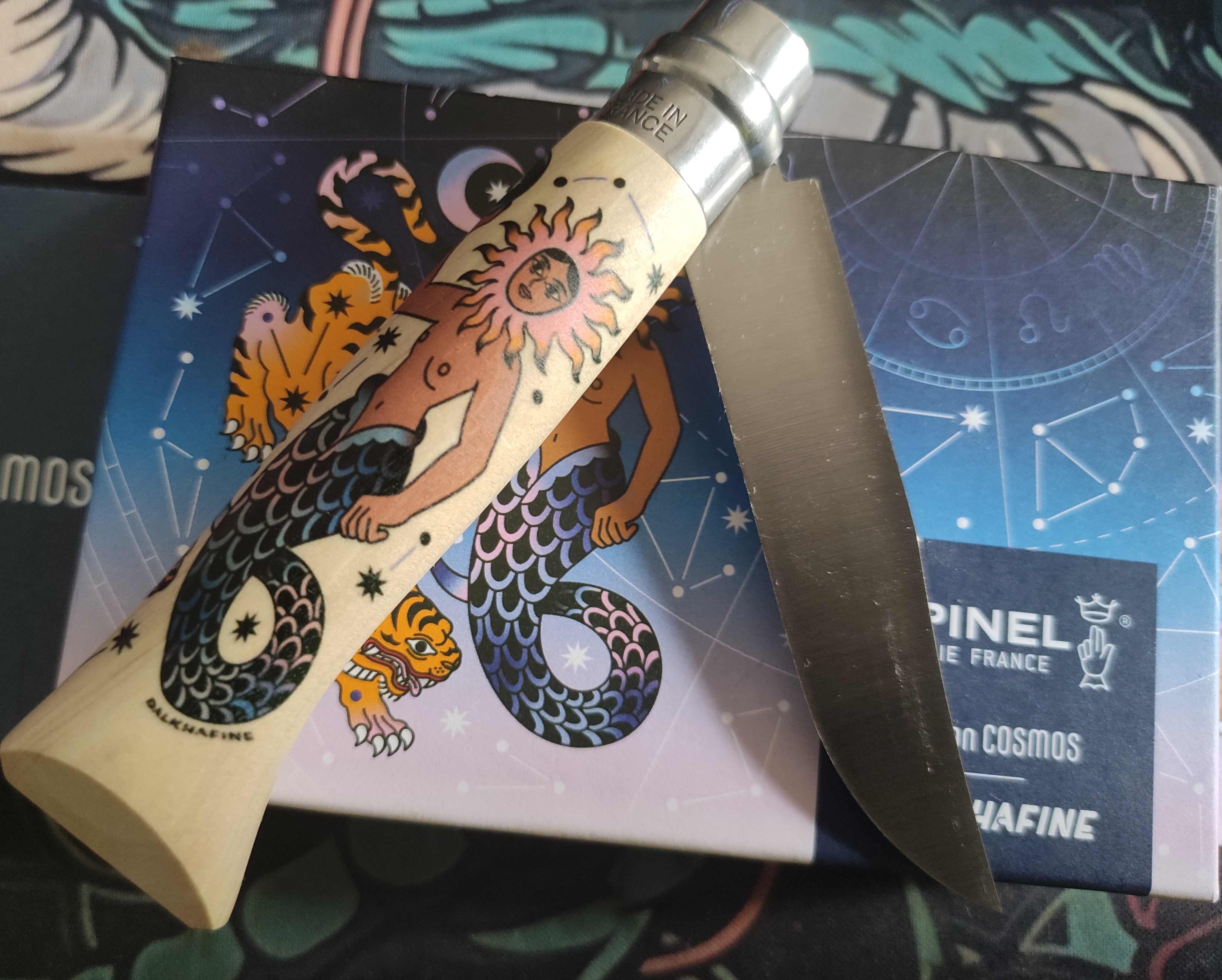 Mit der Cosmos-Kollektion schlägt Opinel optisch etwas modernere Wege ein, ohne die klassische Linie zu verlassen. Das Modell Dalkhafine verbindet die bekannte Opinel-Form mit einem auffälligen, kosmisch inspirierten Griffdesign. Das Muster wirkt lebendig und kontrastreich, fast wie eine abstrakte Darstellung von Sternennebeln oder galaktischen Strukturen. Trotz dieser modernen Optik bleibt das Messer klar als Opinel erkennbar – die geschwungene Klingenform und der schlichte Aufbau sorgen für eine gelungene Balance zwischen Tradition und zeitgemäßem Stil. Es handelt sich hierbei um eine limitierte Auflage von insgesamt 8200 Exemplaren.