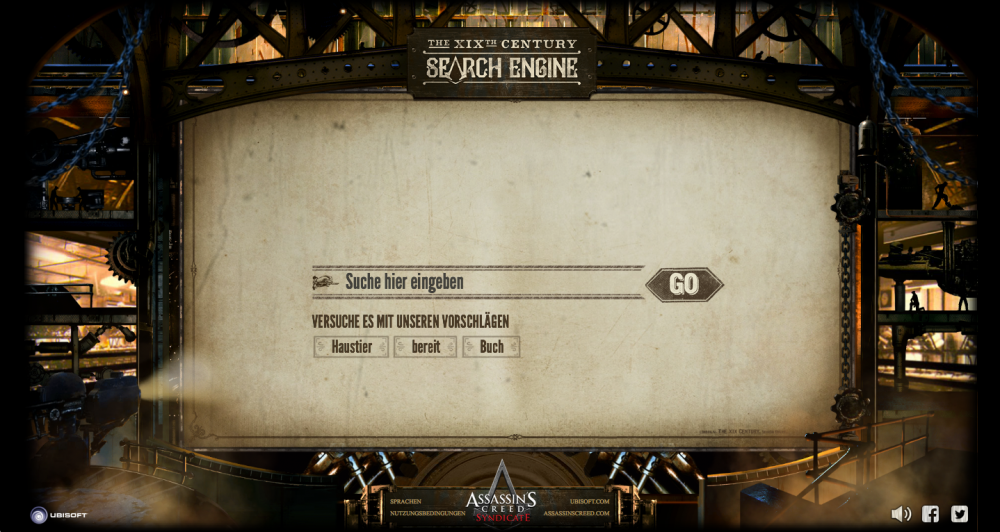 Ubisoft kündigt die Suchmaschine des 19ten Jahrhunderts an. Hierbei handelt es sich um eine Interpretation, wie eine Suchmaschine im Jahre 1868 ausgesehen hätte, wenn das Internet zu jener Zeit bereits existiert hätte.