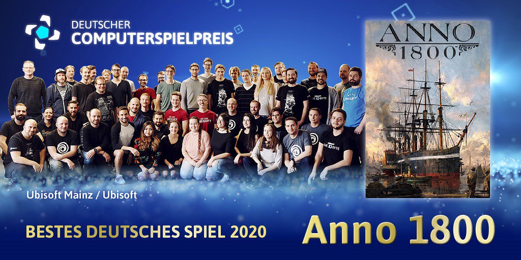 Das Team von Ubisoft Mainz freut sich über die Auszeichnungen "Bestes Deutsches Spiel" und "Bestes Game-Design" beim Deutschen Computerspielpreis 2020„Ubisoft Mainz hat mit Anno 1800 ein echtes Meisterstück abgeliefert. Fans aller Altersstufen spielen es begeistert, und das auf der ganzen Welt. Der DCP ist für das Team jetzt das Sahnehäubchen", sagt Benedikt Grindel, Managing Director der deutschen Ubisoft Studios.