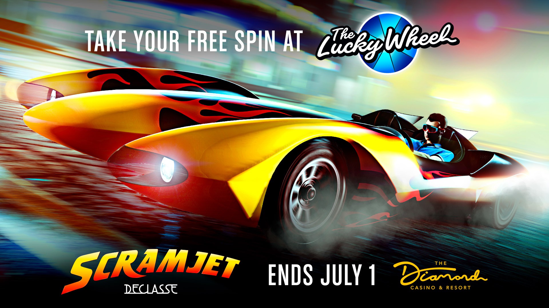 Schaut in der Lobby des Diamond Casino & Resort vorbei und dreht am Glücksrad, um mit etwas Glück ein wenig reicher zurückzukehren, vielleicht mit einem Kleidungsstück als Andenken oder sogar mit einem kostenlosen Satz neuer Schlüssel. Der Hauptpreis der Woche ist der Declasse Scramjet – ein vielseitiges Fahrzeug im Flammendesign, das wunderbar zu blondierten Strähnen passt.