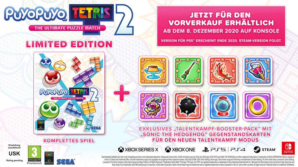 Die physische Puyo Puyo Tetris 2 Limited Edition ist für Nintendo Switch, PlayStation 5, PlayStation 4, die Xbox One Gerätefamilie, inklusive der Xbox Series X|S vorbestellbar.