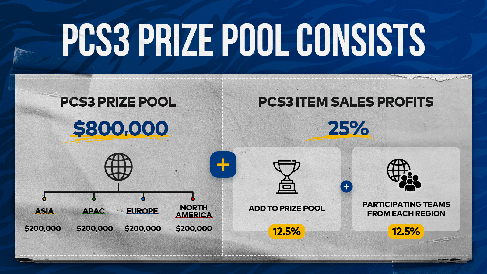 Mit dem großen Finale der PCS3 kommen exklusive neue PCS-Ingame-Gegenstände und die Pick'Em-Challenge zurück. Fans können sich auf PC und Konsole zum Mitfiebern mit seltenen Gegenständen zur PCS3 ausrüsten und durch ihre Käufe die Teams unterstützen, da 25 Prozent der Einnahmen an die teilnehmenden Teams in den vier Regionen fließen. Von diesem Betrag wandern 12,5 Prozent in den Preispool, die anderen 12,5 Prozent werden zu gleichen Teilen an alle Teams verteilt. Zu jedem Kauf eines PCS3-Gegenstandes gibt es mindestens einen Tippgutschein, der für die PCS3 Pick'Em-Challenge verwendet werden kann. Durch die beiden vorigen Pick'Em-Challenges konnten die PCS1- und PCS2-Preistöpfe von 1,6 Mio. US-Dollar auf 3,3 Mio. US-Dollar erhöht werden.