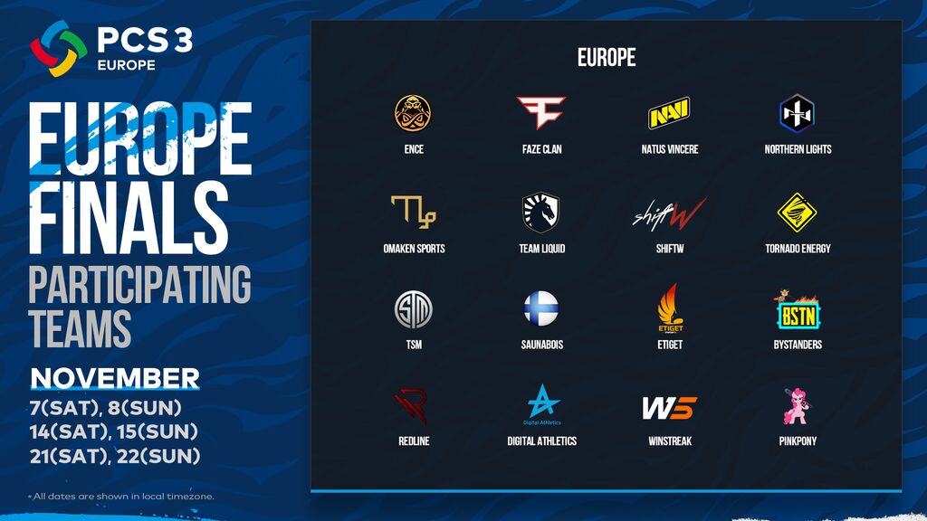 Nach sechs Spieltagen in der PCS3 Europe-Gruppenphase haben sich die folgenden 16 Teams für das Große Finale von PCS3 Europe qualifiziert: Natus Vincere, Northern Lights, Digital Athletics, FaZe Clan, TSM, Omaken Sports, ENCE, shiftW, Team Liquid, Saunabois, Redline, Etiget Esports, Tornado Energy, Bystanders, WinStreak und PinkPony.