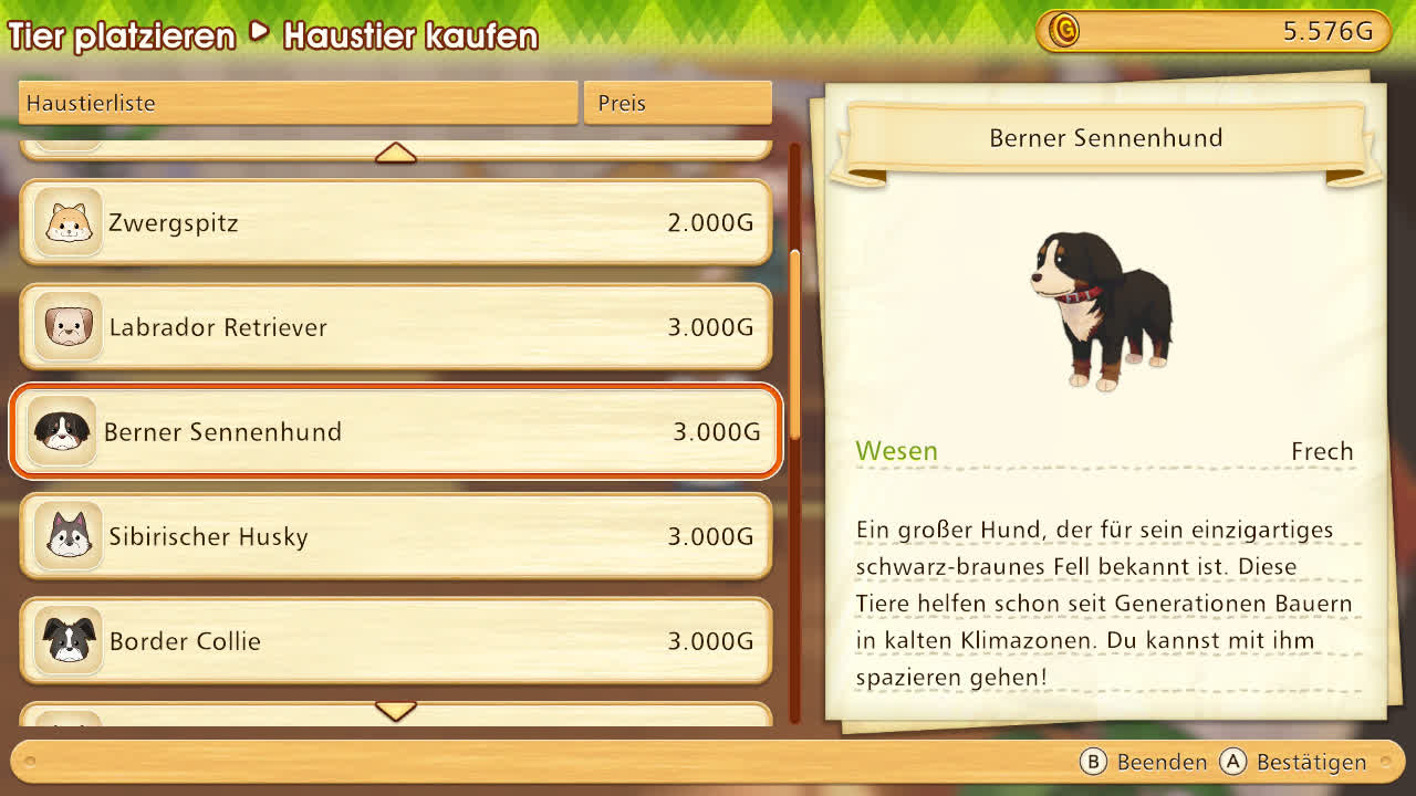 Zu den möglichen Haustieren gehören Hunde und Katzen. Wenn Spieler ihre pelzigen Freunde gut behandeln, helfen sie bei der Arbeit auf der Farm und können sogar an den Haustier-Rennen der Stadt teilnehmen.