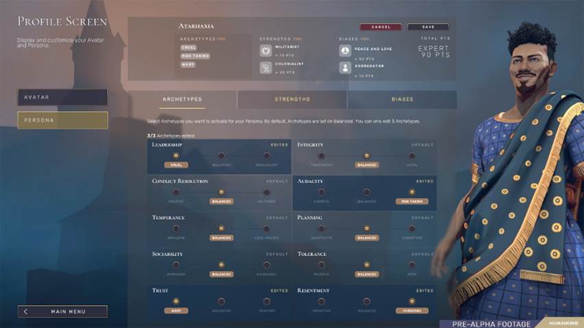 In Humankind können Spieler nicht nur die äußerlichen Erscheinungsmerkmale ihres persönlichen Avatars anpassen. Auch die Persönlichkeitsmerkmale der „KI", die sie während ihrer Abwesenheit repräsentiert, können individuell beeinflusst werden.