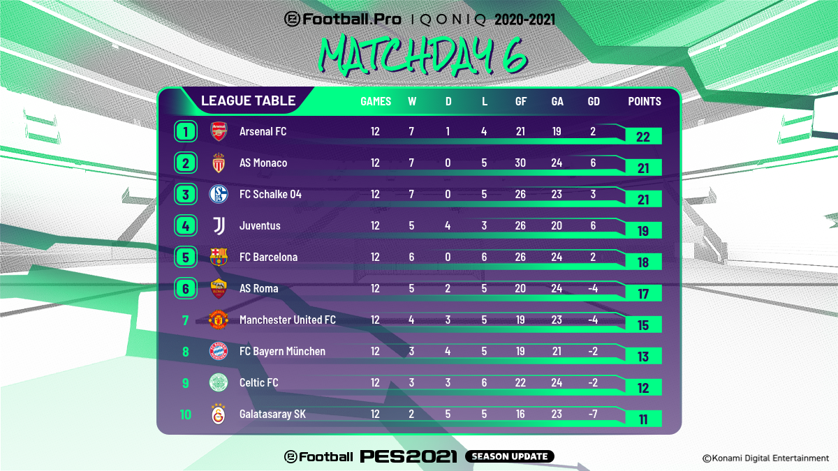 Die Tabelle der eFootball.Pro IQONIQ nach dem sechsten Spieltag sieht wie folgt aus: