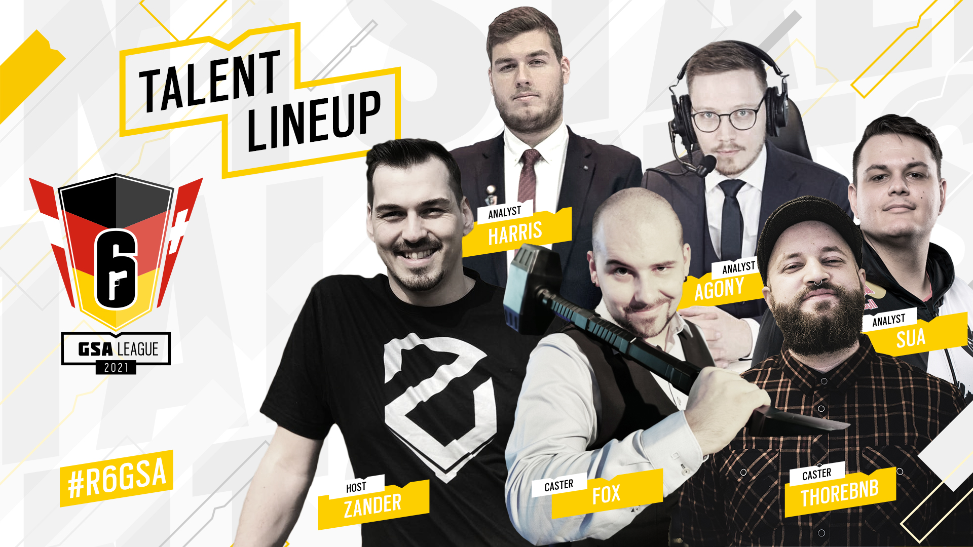 Zudem gab Ubisoft das Moderations-, Caster- und Analysten-Lineup für die GSA League 2021 bekannt. Neben den bekannten Gesichtern um Deskhost Michael "Zander" Müller dürfen sich Rainbow Six E-Sport Fans in dieser Season auch auf Kevin "Sua" Stahnke freuen. Der ehemalige Analyst von G2 Esports bildet zusammen mit Ihno "Harris" Kampen und Lucian "Agony" Kohn das Analysten-Trio der GSA League 2021. Kommentiert werden die Matches von Markus "Fox" Schwenn und Thore "ThoreBNB" Lehmann.