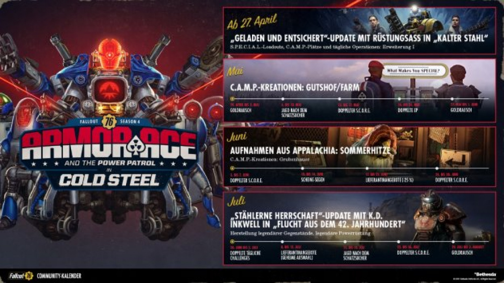 Das „Geladen und entsichert"-Update für Fallout 76 nähert sich mit großen Schritten! Zeitgleich mit dem neuesten Update startet am 27. April auch Saison 4 mit einem neuen Spielbrett. Im neuesten „Aus dem Vault"-Artikel erfahren Sie alles über die neue Saison mit dem Namen Rüstungsass in „Kalter Stahl" und die Belohnungen, auf die Sie sich freuen dürfen. Hier machen sich Rüstungsass und die Power-Patrouille auf den Weg nach Norden, um sich dem furchterregenden Commissioner Chaos und seiner Robo-Schurkenbande, den Yukon Five, entgegenzustellen. Auch in Saison 4 können Sie 100 Ränge erreichen und auf Ihrem Weg eine bunte Vielfalt an Belohnungen einfordern.