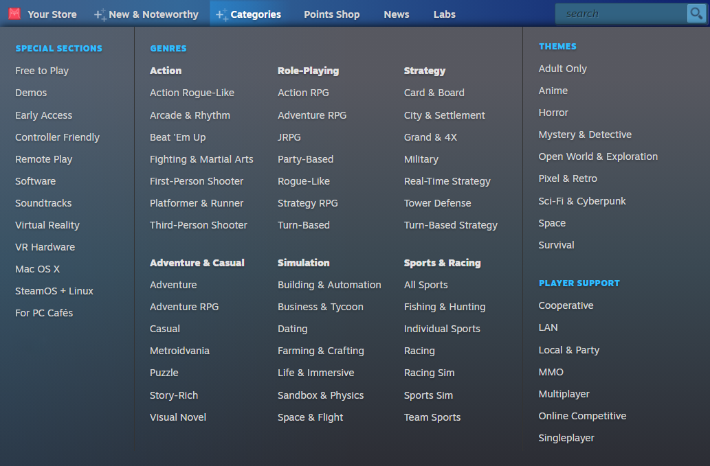 Eine simple Liste von Genres ist zwar leicht zu durchsuchen, ist aber angesichts der wachsenden Vielfalt unseres Katalogs etwas unzureichend. Über unser neues Menü Kategorien können Nutzer schnell und einfach in die Tiefe des Steam-Katalogs eintauchen und für sie interessante Spiele entdecken. In diesem Menü finden Sie Dutzende neuer Spielkategorien zur weiteren Erkundung.