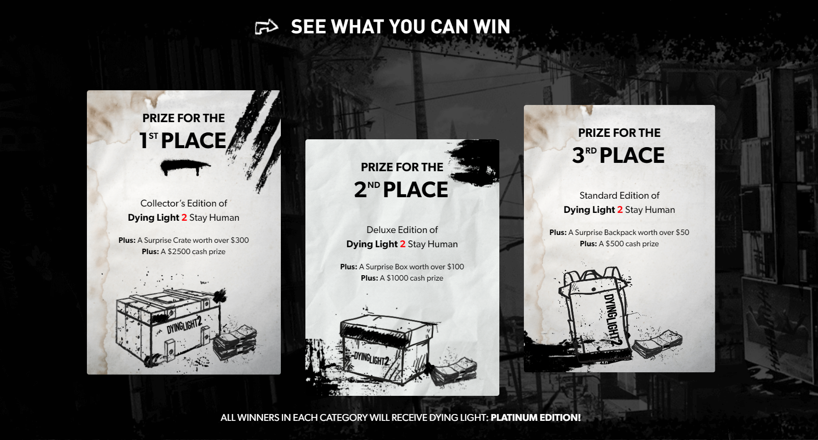 Unterschiedliche Teilnahmekategorien sorgen für mehr Gewinnchancen für kreative Gamer und die großartige Dying Light-Community. Von spannenden Kurzgeschichten über inspirierende Kunst bis hin zu beeindruckendem Cosplay - dieser besondere Wettbewerb ermöglicht es den unterschiedlichsten kreativen Köpfen, ihre Kunst zu teilen.