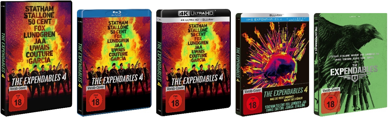 THE EXPENDABLES 4 ist ab dem 22. Dezember 2023 als DVD, Blu-ray und 4K Ultra HD Blu-ray (zuzüglich limitierter Steelbook-Versionen der Blu-ray und 4K Ultra HD Blu-ray) sowie digital erhältlich! Das Bonusmaterial enthält unter anderem zwei Featurettes und einen Audiokommentar von Regisseur Scott Waugh.