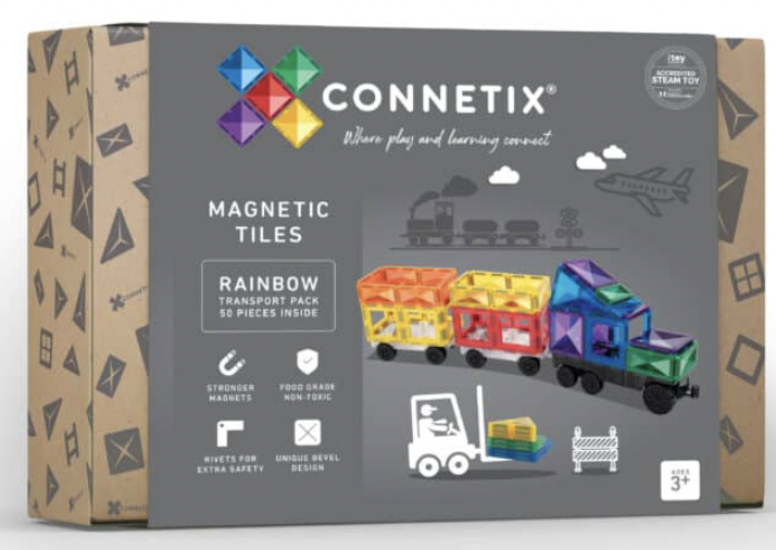 - CONNETIX 50-teiliges Rainbow-Transportpaket (€67): Connetixtiles.com In diesem Paket dreht sich alles um Spaß rund um das Thema Transport. Mit 50 Teilen können Kinder Autos, Züge, Flugzeuge und mehr bauen. Das Rainbow Transport Pack fördert fantasievolles Spielen, Geschichtenerzählen und das Verständnis für verschiedene Transportmittel.