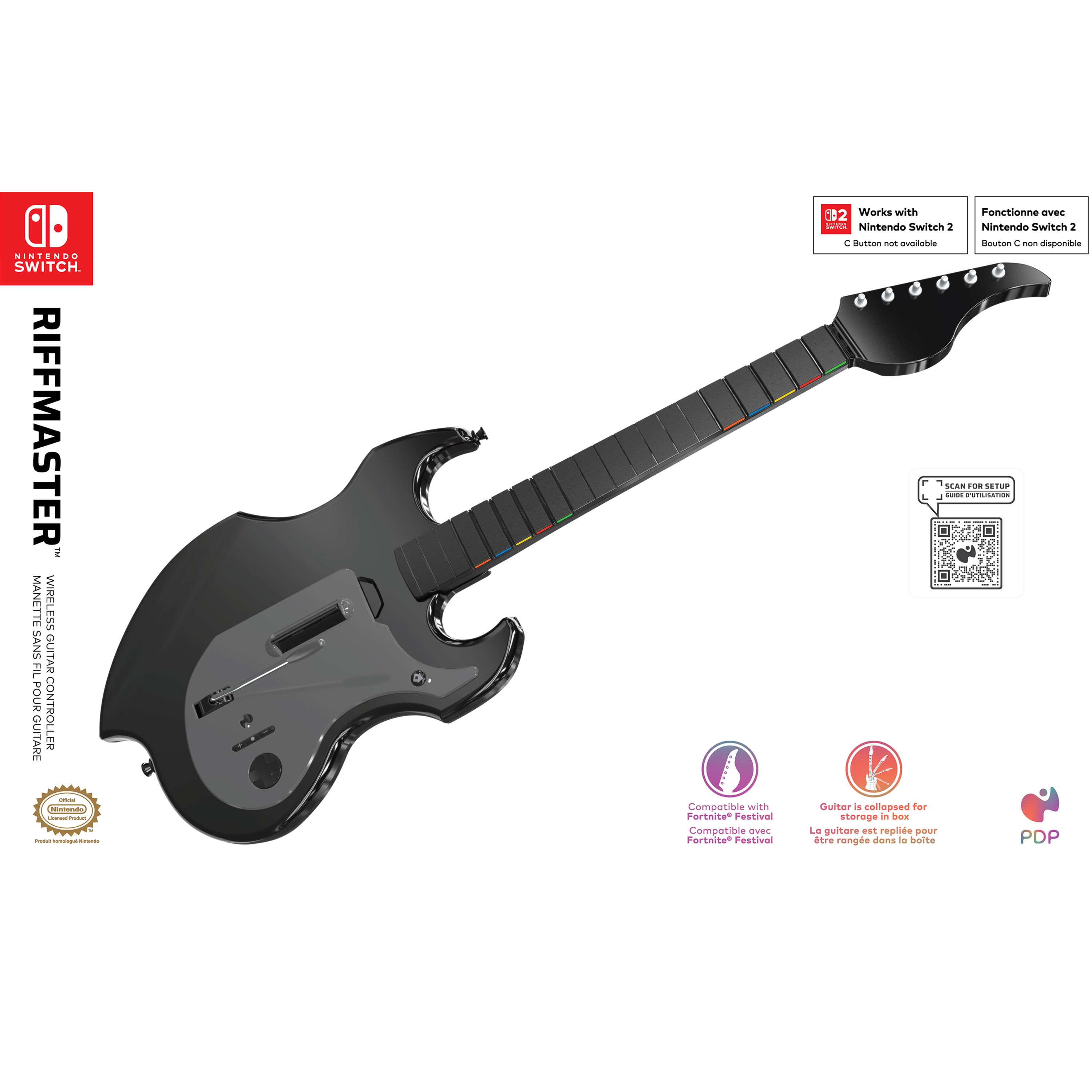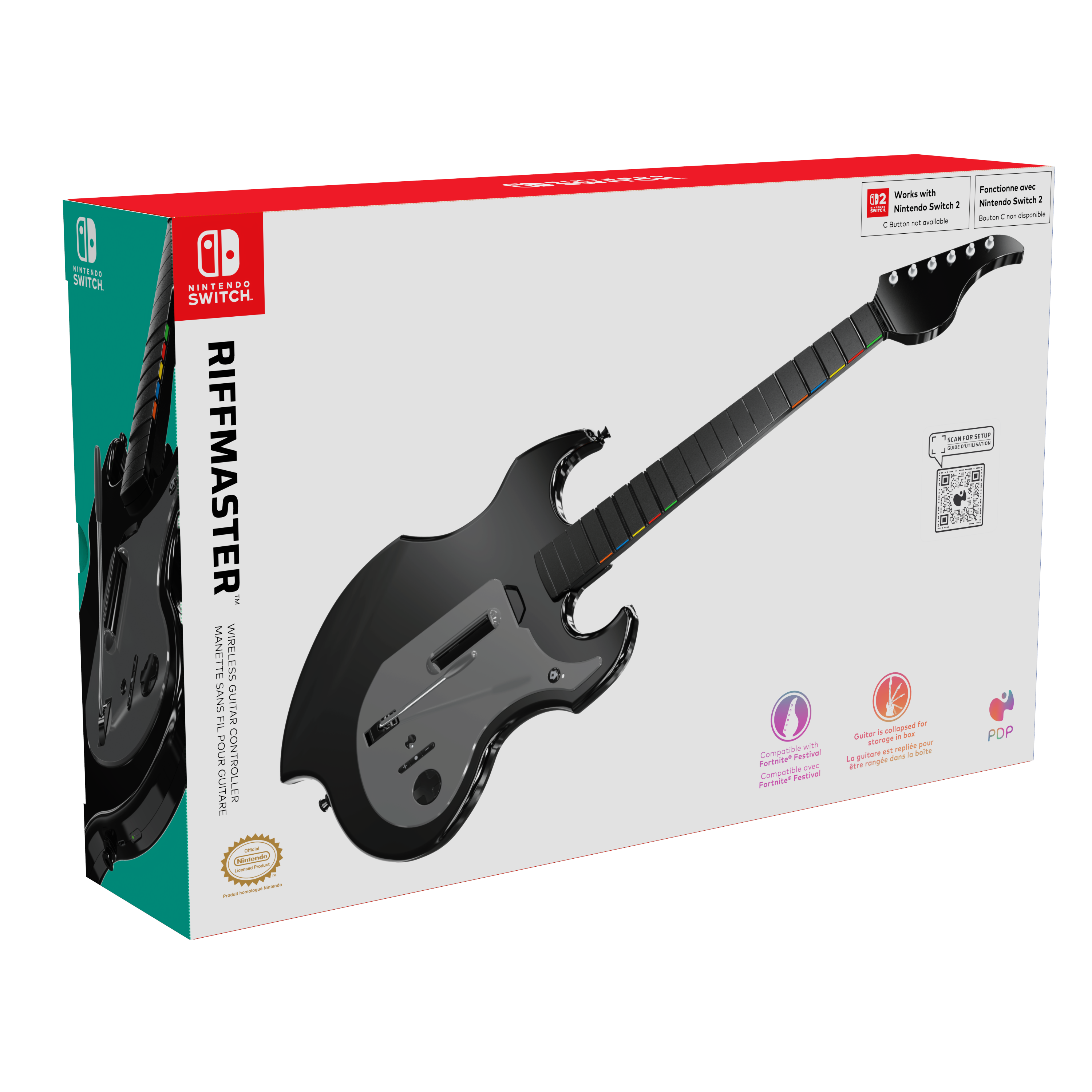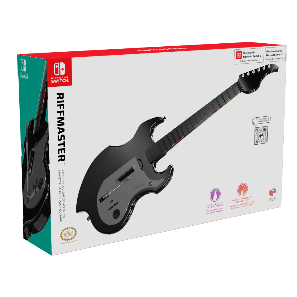 Mit dem kabellosen Gitarren-Controller für Nintendo Switch und Nintendo Switch 2 können Spieler:innen mit beiden Händen spielen, da das Design sowohl für Links- als auch für Rechtshänder:innen geeignet ist. Der Riffmaster verbindet sich über eine kabellose Verbindung mit geringer Latenz in einer Reichweite von bis zu etwa neun Metern und der wiederaufladbare Akku liefert über 35 Stunden Spielspaß pro Ladung. Der Gitarren-Controller verfügt außerdem über ein zusammenklappbares Design, sodass er leicht zu Freund:innen transportiert oder bei Nichtgebrauch verstaut werden kann. Für zusätzlichen Komfort sorgt ein Schultergurt.