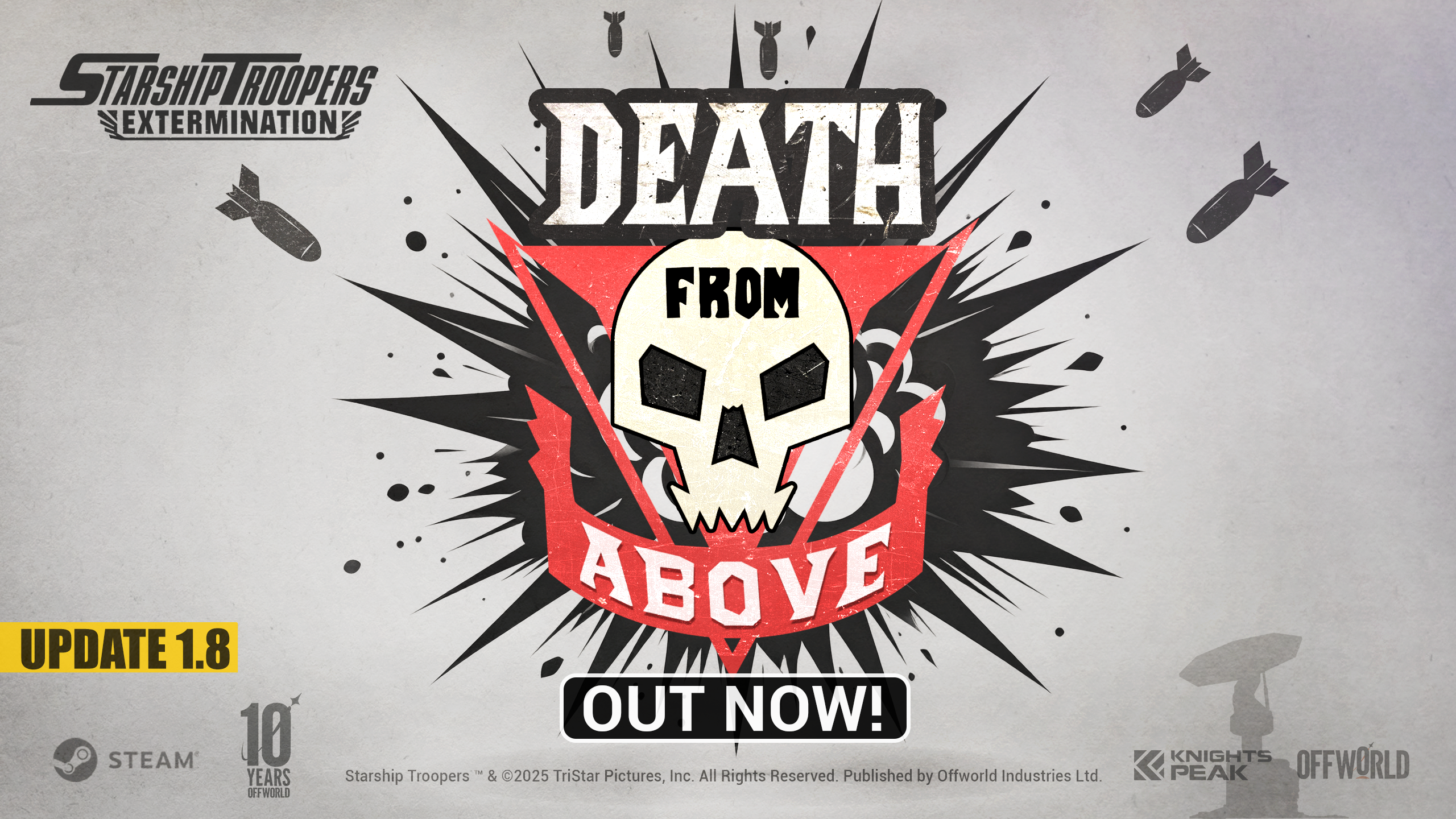 2. Dezember 2025 – Troopers, der Krieg gegen die Insekten flammt an neuen Fronten auf, und General Rico braucht erneut eure Hilfe: Entwickler Offworld und Publisher Knights Peak veröffentlichen Update 1.8 für Starship Troopers: Extermination. Dieses Update führt das neue Kompanie-Fortschrittssystem, eine neue Critical Strike-Karte und Luftangriffe ein – ein brandneues Nebenziel für ARC- und AAS-Missionen.