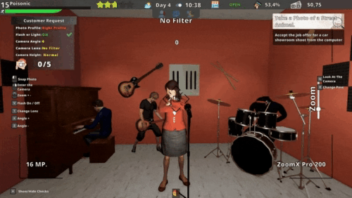 In Photographer's Life Simulator hast du dein eigenes Fotogeschäft eröffnet und bietest Fotografien an. Zu Beginn kannst du nur normale Fotos schießen, je zufriedener deine Kunden sind und, desto mehr Erfahrungspunkte du dadurch sammelst, je schneller kannst du aufsteigen und schon weitere Kategorien eröffnen wie bspw. Bandfotos und Anlässe. Deine Kunden zahlen für deine Arbeit, jedoch nur dann den vollen Preis, wenn du ihre Bedürfnisse erfüllst, dazu gehören die richtige Pose, Licht, Hintergrund und Kamerawinkel. Mit dem verdienten Geld kannst du dann dein Geschäft erweitern, dir ein Fahrrad kaufen oder besseres Equipment besorgen, um qualitativ hochwertigere Fotos zu schießen. Mehr Kunden bedeuten mehr Geld, gleichzeitig aber auch mehr Diebe die deine Kasse ausrauben, passe daher gut auf, denn deine täglichen Einnahmen werden gebraucht.