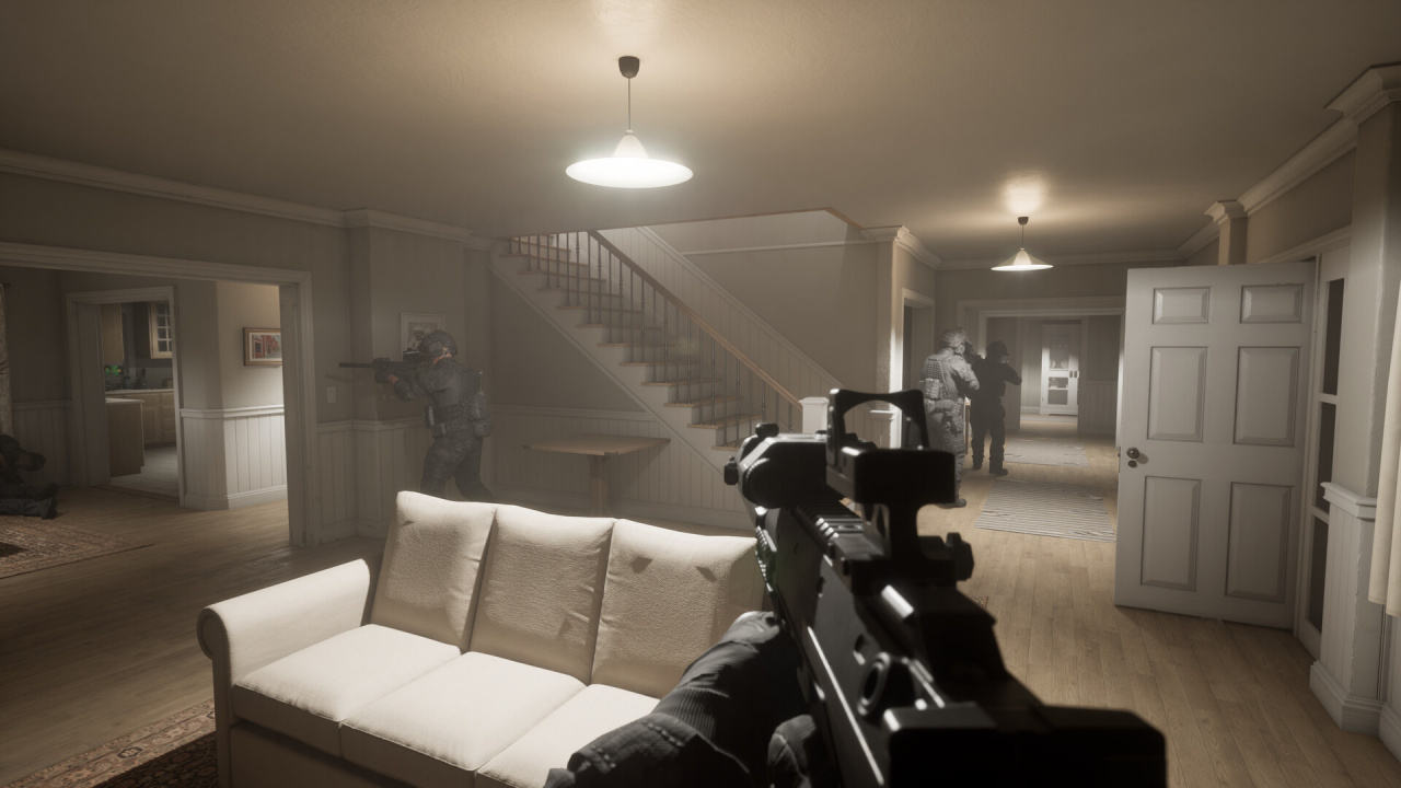 Grafisch bewegt sich das Spiel im mittleren Bereich. Umgebungen sind realistisch gestaltet, mit urbanen Schauplätzen, Gebäuden und Innenräumen. Texturen wirken solide, aber nicht hochmodern. Beleuchtung und Effekte sind zweckmäßig umgesetzt. Animationen sind funktional, könnten aber noch flüssiger wirken. Insgesamt passt die Optik zum realistischen Anspruch, ohne visuell herausragend zu sein. Der Sound unterstützt die taktische Ausrichtung. Waffen klingen kraftvoll und differenziert, Schüsse hallen in Innenräumen realistisch nach. Umgebungsgeräusche wie Schritte, Funksprüche und entfernte Explosionen tragen zur Spannung bei. Musik bleibt dezent im Hintergrund und tritt meist hinter das Geschehen zurück.
