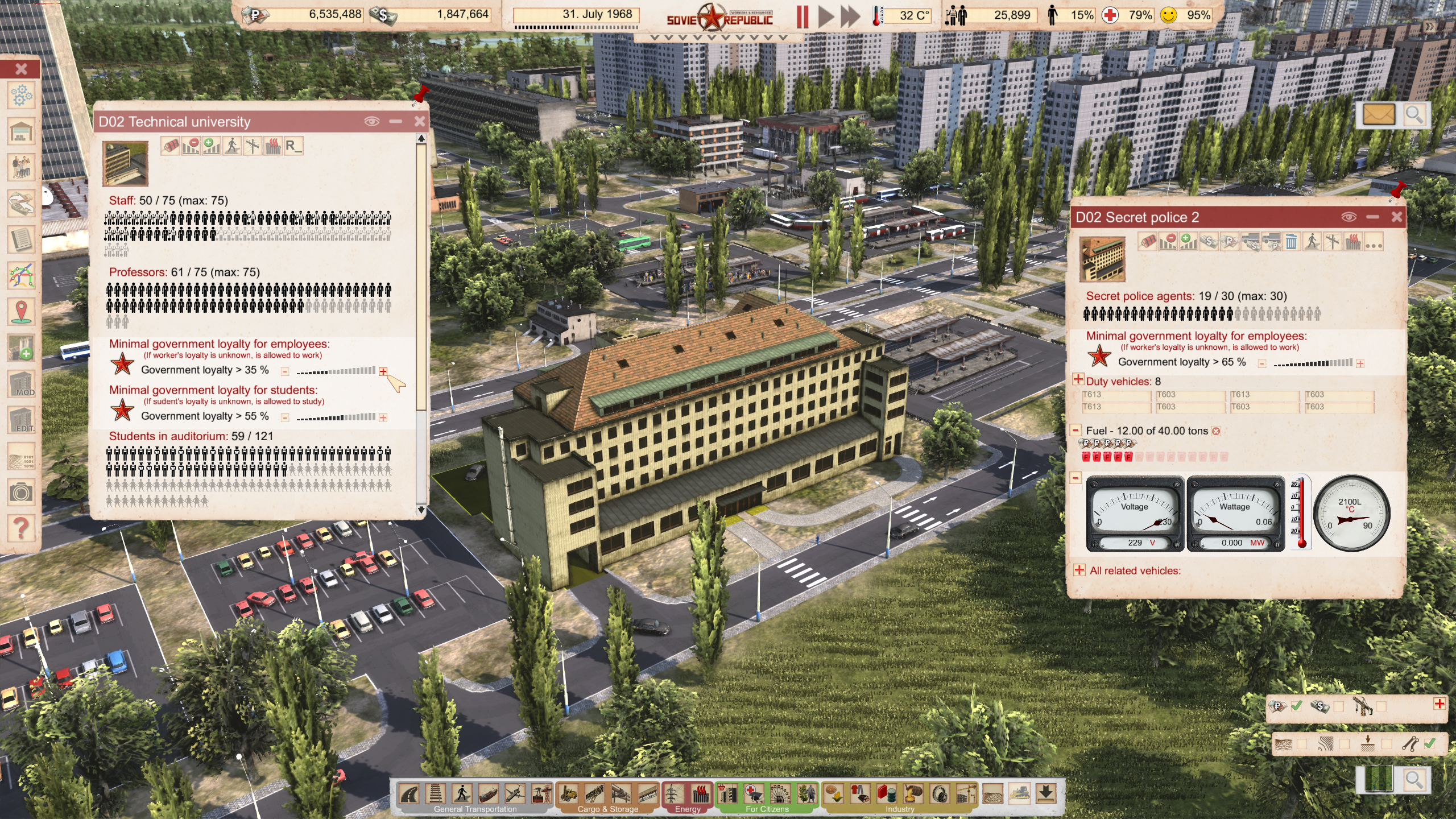 The secret police building is where only the highly educated citizens can work. They will have duty vehicles assigned to them which look like personal cars but are assigned to the secret police building. This allows the secret police to travel undercover to residential areas and install spy equipment into citizens homes to gather loyalty information on the people living there.