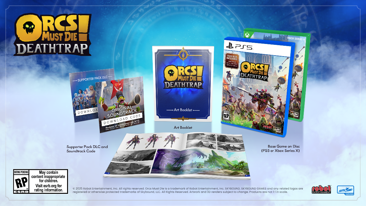 PLANO, TX & LOS ANGELES, CA– May 28, 2025 – Robot Entertainment, the independent development and publishing studio behind the beloved Orcs Must Die! series, today announced that Orcs Must Die! Deathtrap is coming to the PlayStation® Store on July 29, 2025 for PlayStation 5. In partnership with Skybound Games, Orcs Must Die! Deathtrap will also be available in physical editions for both PS5 and Xbox Series X/S on September 23, 2025 with pre-orders now available at select global retailers.