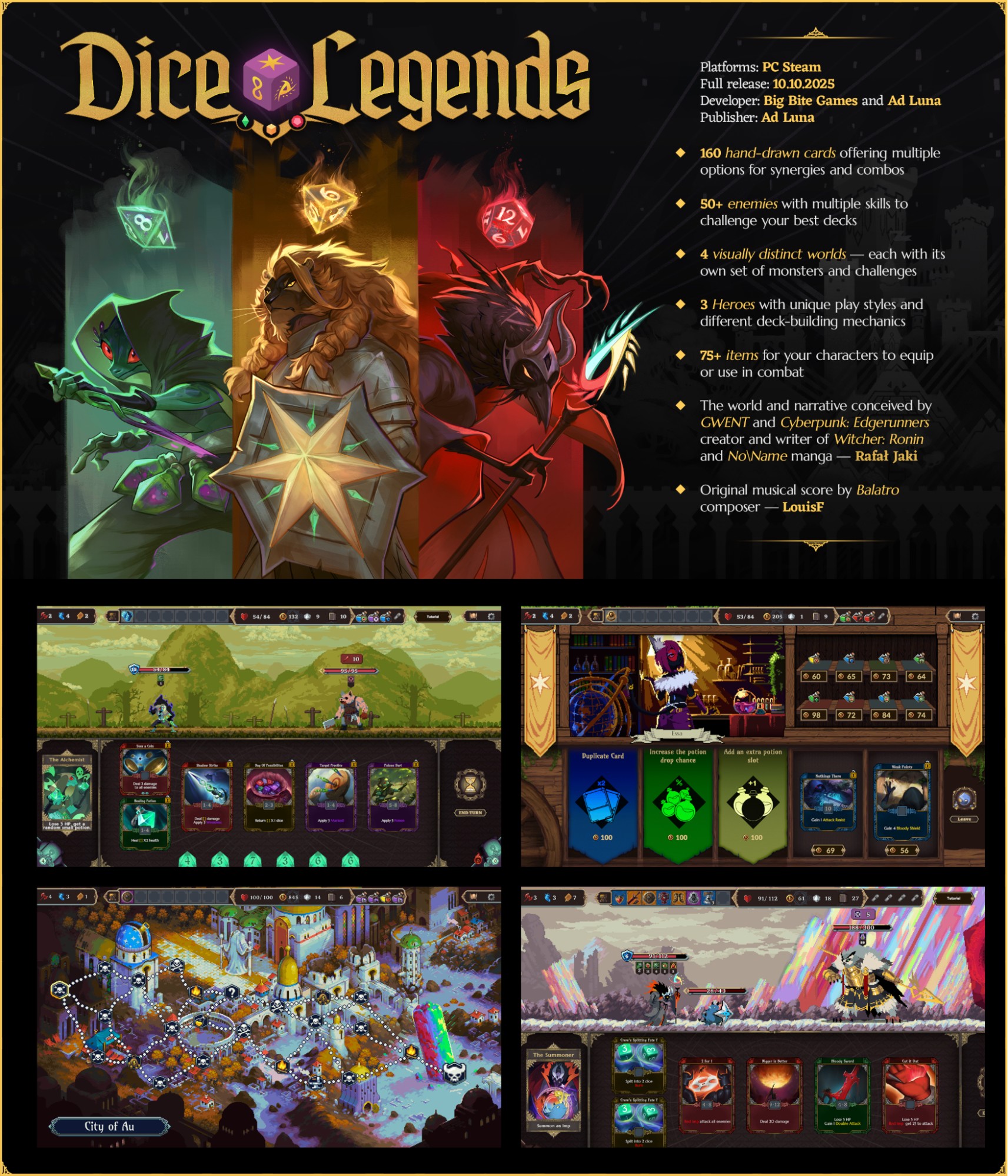 Developed by a small and ambitious indie team including Rafał Jaki — the creative behind Cyberpunk: Edgerunners and GWENT — Dice Legends is both a love letter to the deckbuilding genre popularized by Slay the Spire, and an attempt to further elevate it with fresh ideas and mechanics. The game features an upbeat original score created by Balatro's music composer LouisF. To stay up to date with Dice Legends, players can wishlist or buy the game on Steam, follow the game on X and YouTube, and join the player Discord. ### Facts: