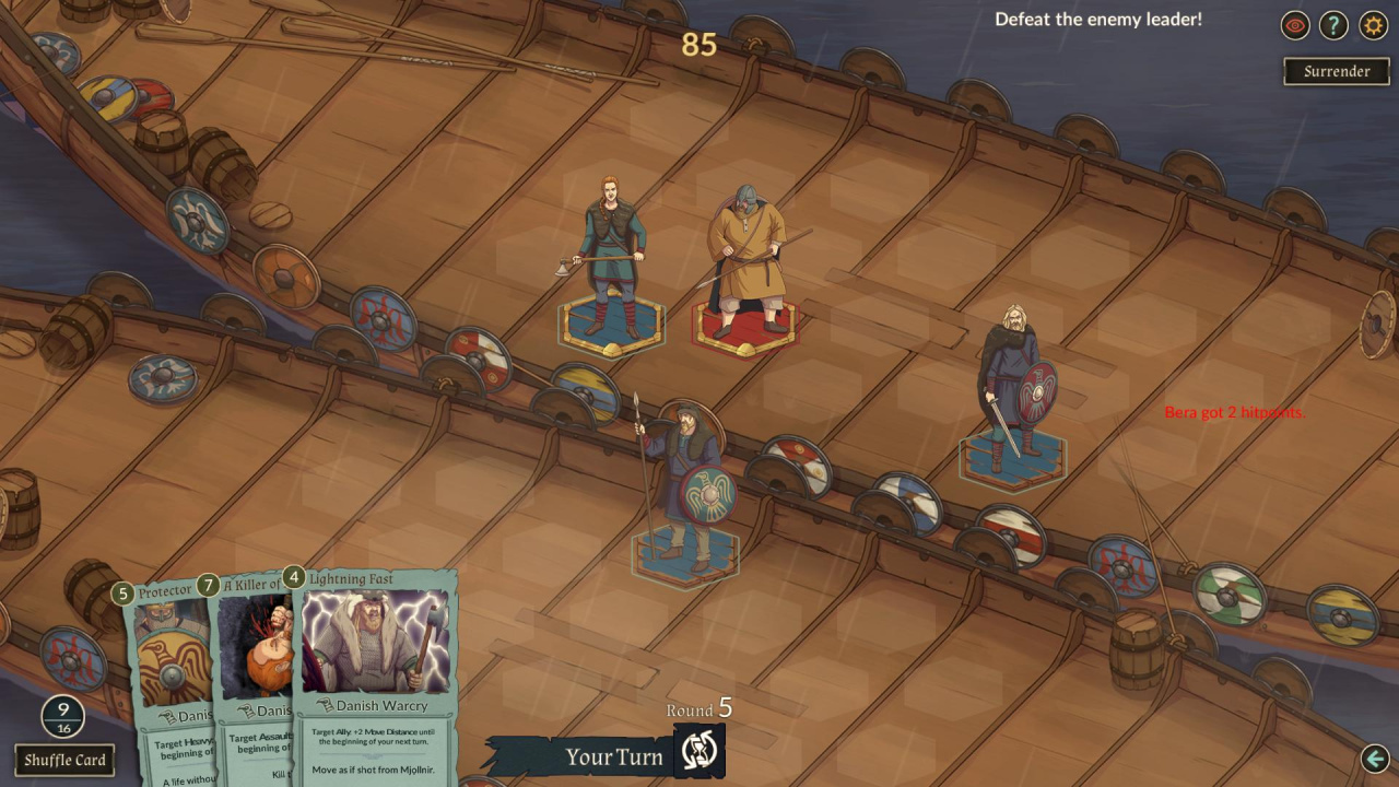 Combat in The Great Whale Road centers around a random card system. Each of your warriors can carry three cards, and you can shuffle none or all of these cards every turn to receive new ones. You can use the cards to bolster your defense, your offensive attacks, call other heroes into battle, etc. I am a bit divided on this system. On the one hand I like the randomness of it. On the other hand, it’s pretty annoying when the enemy is calling in 2, 3, 4 warriors and I am spending my turns desperately shuffling my cards, hoping to pull a hero card so I can get some men to even the odds. I would prefer a better system here, since the randomness will surely lead to your doom if you can’t pull hero cards quickly enough.Another feature that would be nice to see is swapping cards among your warriors. Pulling a hero who hits hard is great, but when you have two tank-like characters on the board it would be nice to have cards that aren’t just more heavy attacks, big defensive boosts and so on. The ability to swap cards would open up a bit of depth in the system, especially if the ability to “accept” a card from an ally character could be unlocked through a skill tree or once a certain experience level is reached.